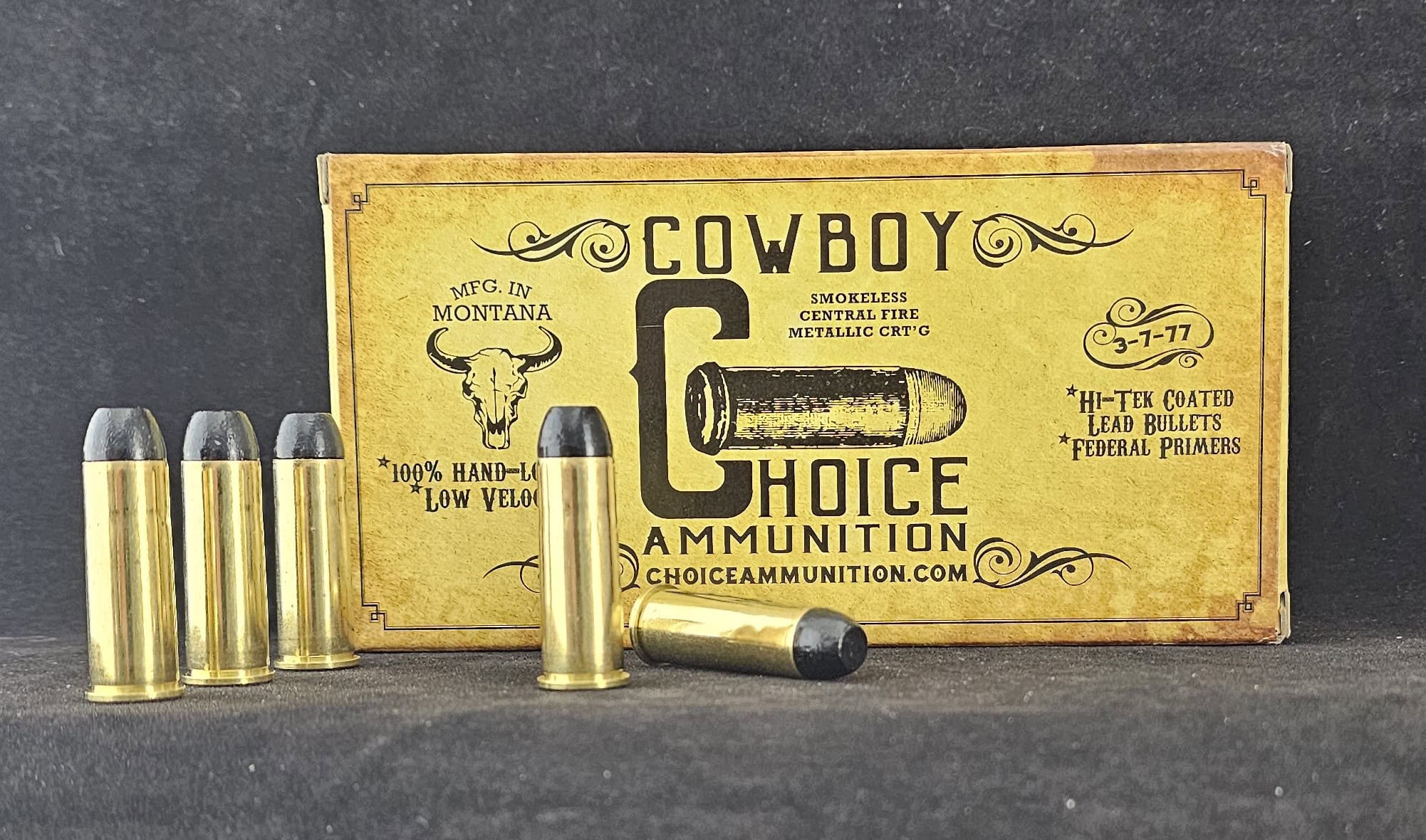 Choice Ammunition is proud to offer this truly historic cartridge which has been fine tuned and perfected specifically for use by Cowboy Action Shooters, but is also a high performing round for recreational shooters and those who love to shoot the Guns that Won the West !! Extensive development was put into this cartridge to ensure flawless feeding in 1860, 1866 and 1873 Winchester lever action rifles. Cowboy Action Shooters and modern gunsmiths have modified these lever guns to perform of speeds never imagined by the designers. Highly polished internals, reduced weight springs, modified lifters and linkages allow these rifle to cycle and fire 10 rounds as fast 1.6 seconds. If the ammunition is not made to high standards, this would not be possible. 100% New Brass Cases, BLACK Hi-Tek Coated Bullets !! Almost ZERO Lead Fouling !! 100% Hand Loaded !! Developed by Real Cowboy Action Shooters!! 100% Federal Primers !! Low recoil, a super accurate revolver and rifle round!! We put the same care into each round as you would at your own loading bench !! Meets SASS Power Factor for Cowboy Action and Wild Bunch !!
