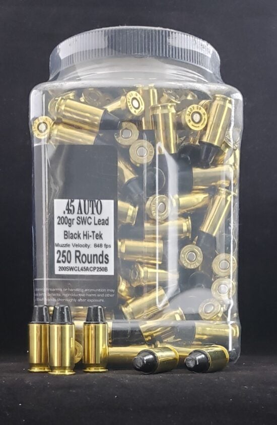.45 Auto 200 grain Black Hi-Tek Coated SWC- The .45 ACP (Automatic Colt Pistol), or .45 Auto is a handgun cartridge designed by John Browning in 1905, for use in his prototype Colt semi-automatic pistol. After successful military trials, it was adopted as the standard chambering for Colt’s M1911 pistol, being named .45 ACP. It came to life as a result of unsatisfactory performance of the .38-caliber handgun our Armed Forces were using during the Philippine-American War at the end of the 19th century. Soldiers had noted that the .38 handguns were definitely less effective than the .45 caliber Colt Single Action Army. The Army Ordinance Department agreed, and development of a new sidearm began. Germany’s DWM, and the American firms of Savage and Colt (the Browning design) submitted new designs, with the Colt pistol and cartridge coming out on top. This iconic combination was officially adopted as the M1911, firing “Cal. 45 Automatic Pistol Ball Cartridge, Model of 1911.” The original load centered around a 200-grain bullet at 900 fps, but was revised to the formula we all know, driving a 230-grain round nosed bullet at a muzzle velocity of 850 fps. The .45 ACP was an immediate success, and continues to be so to this day.